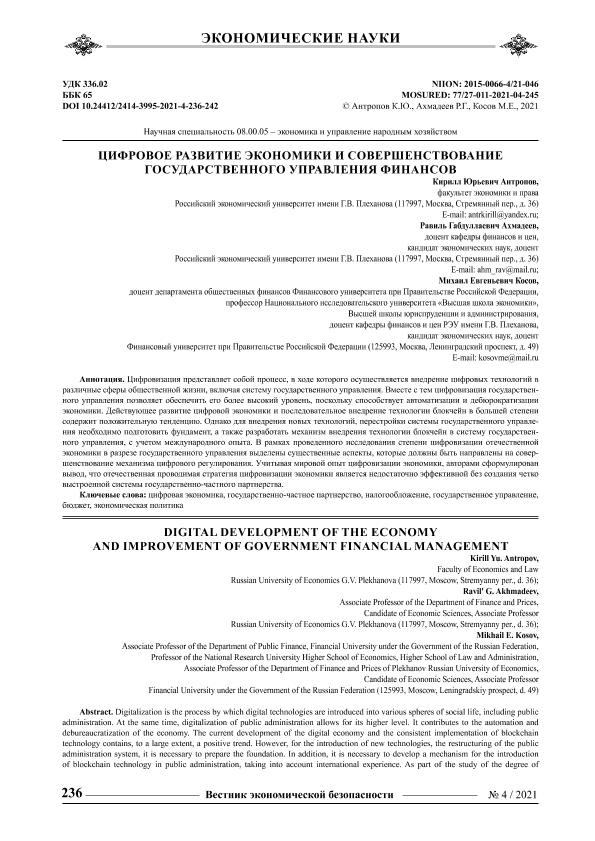 Антропов К.Ю. Цифровое развитие экономики и совершенствование государственного управления финансов / Антропов К.Ю., Ахмадеев Р.Г., Косов М.Е. // Вестник экономической безопасности. – 2021. – № 4.- С.236-242. — Только в электронном виде. — <URL:http://elib.fa.ru/art2021/bv3541.pdf>.