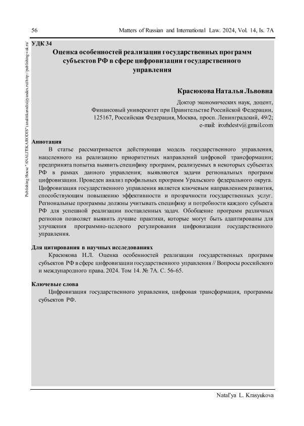 Красюкова, Н.Л. Оценка особенностей реализации государственных программ субъектов РФ в сфере цифровизации государственного управления // Вопросы российского и международного права. – 2024. – № 7А. — С. 56-65. — Только в электронном виде. — <URL:http://elib.fa.ru/art2024/bv3551.pdf>.