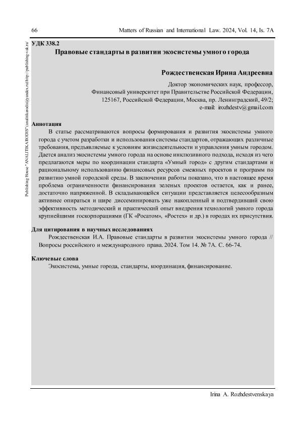 Рождественская, И.А. Правовые стандарты в развитии экосистемы умного города // Вопросы российского и международного права. – 2024. – № 7А. — С. 66-74. — Только в электронном виде. — <URL:http://elib.fa.ru/art2024/bv3552.pdf>.