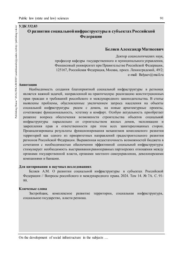 Беляев, А.М. О развитии социальной инфраструктуры в субъектах Российской Федерации // Вопросы российского и международного права. – 2024. – № 7А. — С. 91-99. — Только в электронном виде. — <URL:http://elib.fa.ru/art2024/bv3553.pdf>.