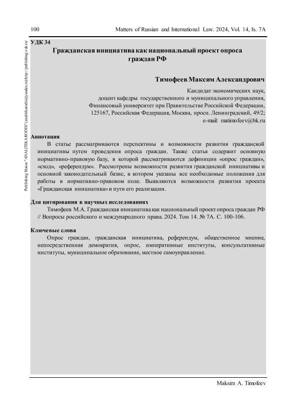 Тимофеев, М.А. Гражданская инициатива как национальный проект опроса граждан РФ // Вопросы российского и международного права. – 2024. – № 7А. — С. 100-106. — Только в электронном виде. — <URL:http://elib.fa.ru/art2024/bv3554.pdf>.