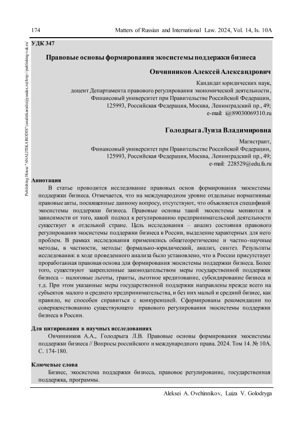 Овчинников, А.А. Правовые основы формирования экосистемы поддержки бизнеса / А.А. Овчинников, Л.В. Голодрыга // Вопросы российского и международного права. – 2024. – № 10А. — С. 174-180. — Только в электронном виде. — <URL:http://elib.fa.ru/art2024/bv3555.pdf>.