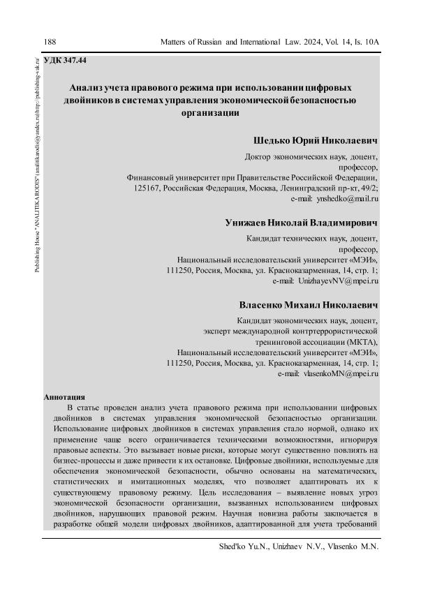 Шедько, Ю.Н. Анализ учета правового режима при использовании цифровых двойников в системах управления экономической безопасностью организации / Ю.Н. Шедько, Н.В. Унижаев, М.Н. Власенко // Вопросы российского и международного права. – 2024. – № 10А. — С. 188-200. — Только в электронном виде. — <URL:http://elib.fa.ru/art2024/bv3556.pdf>.