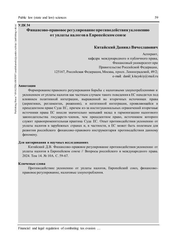 Китайский, Д.В. Финансово-правовое регулирование противодействия уклонению от уплаты налогов в Европейском союзе // Вопросы российского и международного права. – 2024. – № 10А. — С. 59-67. — Только в электронном виде. — <URL:http://elib.fa.ru/art2024/bv3557.pdf>.