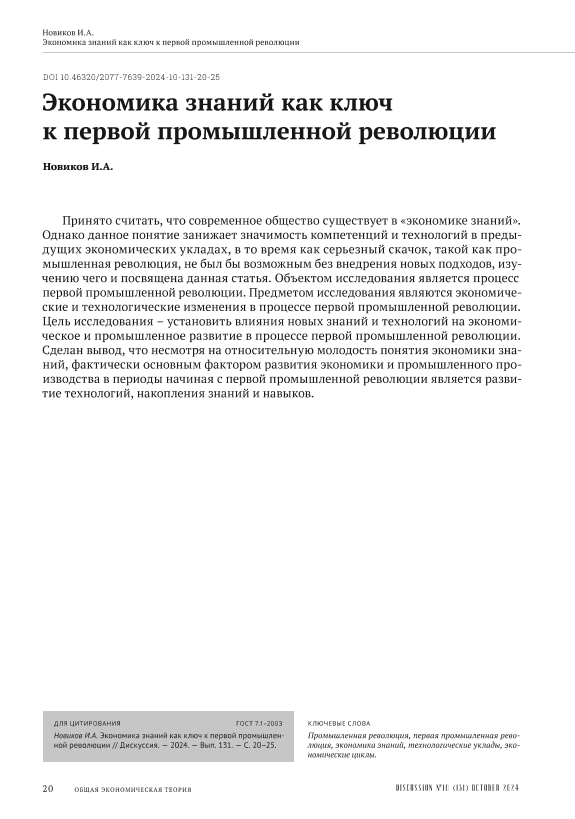 Новиков, И.А. Экономика знаний как ключ к первой промышленной революции // Дискуссия. – 2024. – № 131. — С. 20-25 — <URL:http://elib.fa.ru/art2024/bv3558.pdf>.