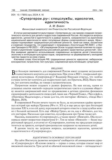 Вафин, А.М. «Супергерои.ру»: спецслужбы, идеология, идентичность // Знание. Понимание. Умение. – 2024. – № 4. — С. 198-205. — Только в электронном виде. — <URL:http://elib.fa.ru/art2024/bv3735.pdf>.