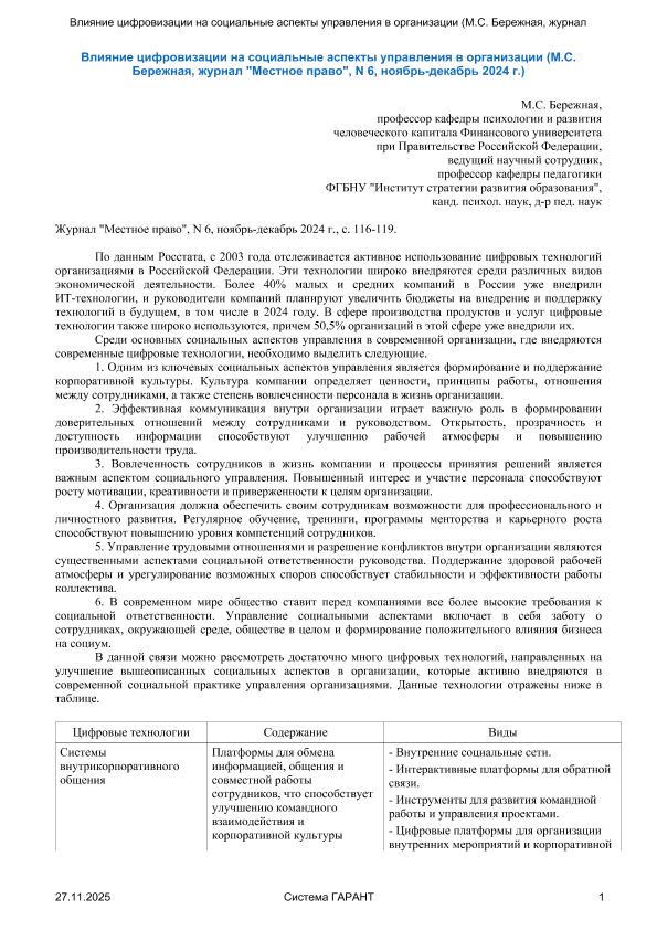 Бережная, М.С. Влияние цифровизации на социальные аспекты управления в организации // Местное право. – 2024. – № 6. — С. 116-119. — Только в электронном виде. — <URL:http://elib.fa.ru/art2024/bv4011.pdf>.