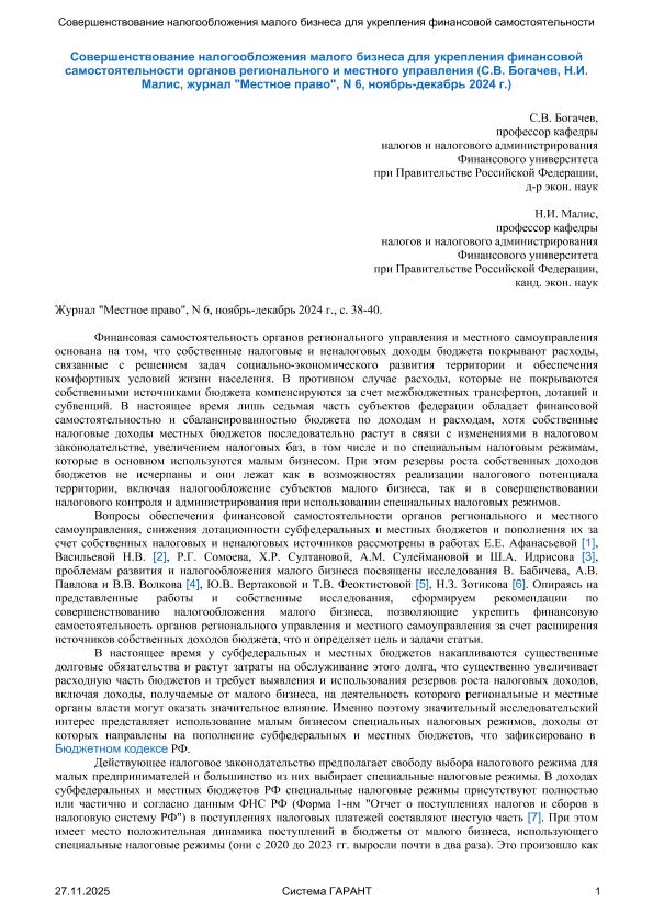 Богачев, С.В. Совершенствование налогообложения малого бизнеса для укрепления финансовой самостоятельности органов регионального и местного управления / С.В. Богачев, Н.И. Малис // Местное право. – 2024. – № 6. — С. 38-40. — Только в электронном виде. — <URL:http://elib.fa.ru/art2024/bv4012.pdf>.
