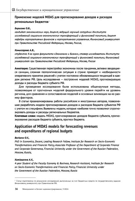 Борисова, О.В. Применение моделей MIDAS для прогнозирования доходов и расходов региональных бюджетов / О.В. Борисова, А.В. Комиссарова // Менеджмент и бизнес-администрирование. – 2024. – № 3. — С. 56-65. — Только в электронном виде. — <URL:http://elib.fa.ru/art2024/bv4013.pdf>.