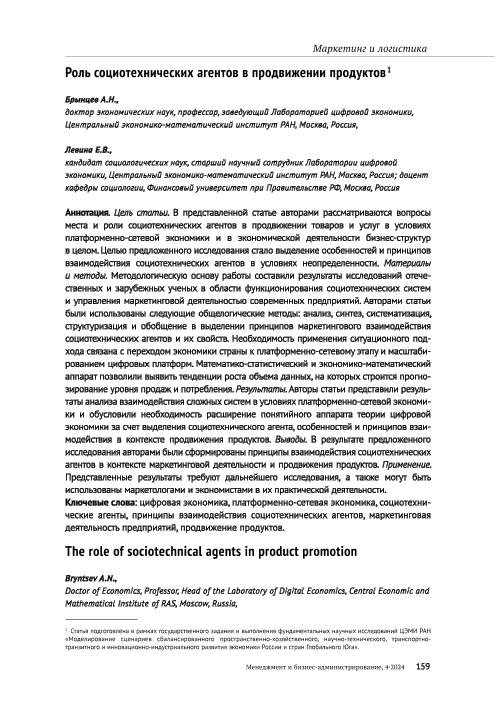 Брынцев, А.Н. Роль социотехнических агентов в продвижении продуктов / А.Н. Брынцев, Е.В. Левина // Менеджмент и бизнес-администрирование. – 2024. – № 4. — С. 159-166. — Только в электронном виде. — <URL:http://elib.fa.ru/art2024/bv4014.pdf>.