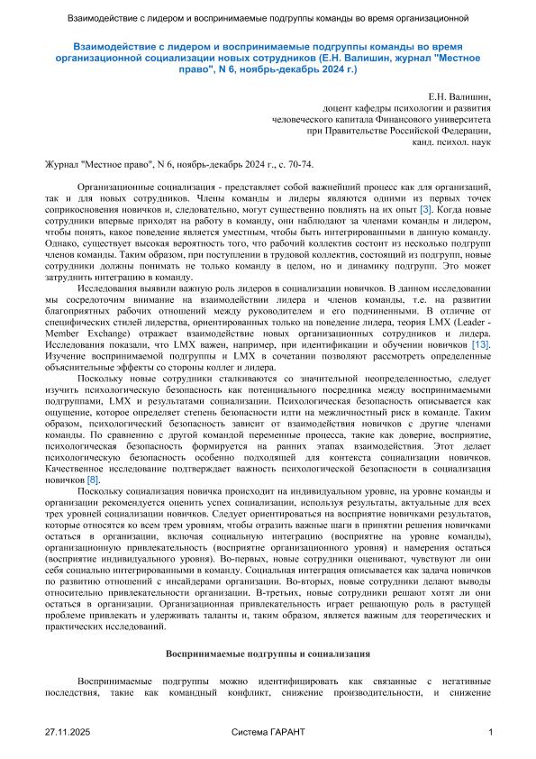 Валишин, Е.Н. Взаимодействие с лидером и воспринимаемые подгруппы команды во время организационной социализации новых сотрудников // Местное право. – 2024. – № 6. — С. 70-74. — Только в электронном виде. — <URL:http://elib.fa.ru/art2024/bv4015.pdf>.