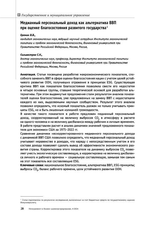 Еремин, В.В. Медианный персональный доход как альтернатива ВВП при оценке благосостояния развитого государства / В.В. Еремин, С.Н. Сильвестров // Менеджмент и бизнес-администрирование. – 2024. – № 4. — С. 28-47. — Только в электронном виде. — <URL:http://elib.fa.ru/art2024/bv4016.pdf>.