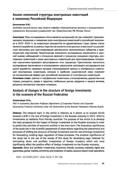 Ермоловская, О.Ю. Анализ изменений структуры иностранных инвестиций в экономику Российской Федерации // Менеджмент и бизнес-администрирование. – 2024. – № 3. — С. 99-106. — Только в электронном виде. — <URL:http://elib.fa.ru/art2024/bv4017.pdf>.