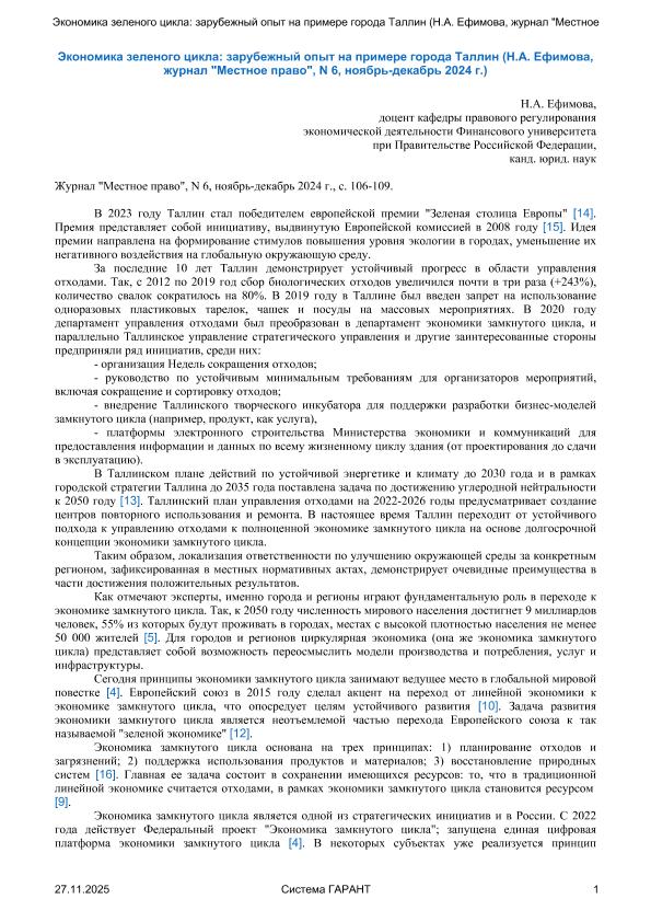 Ефимова, Н.А. Экономика зеленого цикла: зарубежный опыт на примере города Таллин // Местное право. – 2024. – № 6. — С. 106-109. — Только в электронном виде. — <URL:http://elib.fa.ru/art2024/bv4018.pdf>.