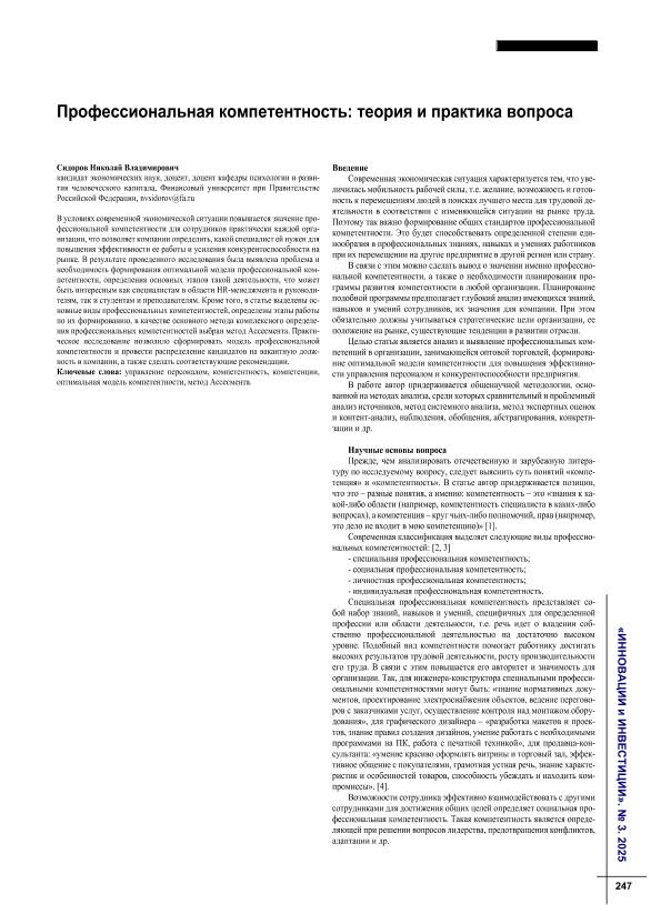 Сидоров, Н.В. Профессиональная компетентность: теория и практика вопроса // Инновации и инвестиции. – 2025. – № 3. — С. 247-250. — Только в электронном виде. — <URL:http://elib.fa.ru/art2025/bv1249.pdf>.