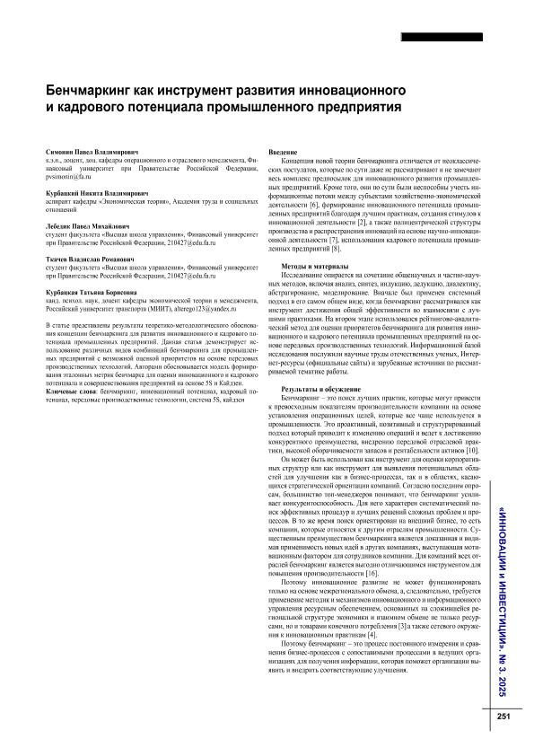 Бенчмаркинг как инструмент развития инновационного и кадрового потенциала промышленного предприятия / П.В. Симонин, Н.В. Курбацкий, П.М. Лебедик [и др.] // Инновации и инвестиции. – 2025. – № 3. — С. 251-254. — Только в электронном виде. — <URL:http://elib.fa.ru/art2025/bv1250.pdf>.
