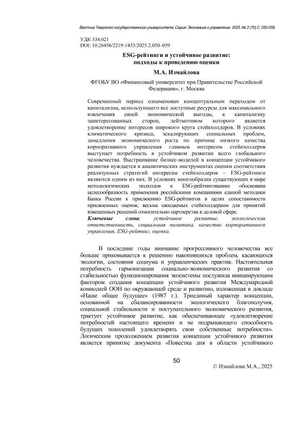 Измайлова, М.А. ESG-рейтинги и устойчивое развитие: подходы к проведению оценки // Вестник Тверского государственного университета. Серия: Экономика и управление. – 2025. – № 2. — С. 050-059. — Только в электронном виде. — <URL:http://elib.fa.ru/art2025/bv1356.pdf>.