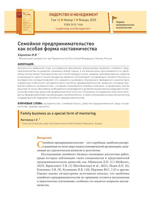 Корнеева, И.В. Семейное предпринимательство как особая форма наставничества // Лидерство и менеджмент. – 2025. – № 1. — С. 9-20. — Только в электронном виде. — <URL:http://elib.fa.ru/art2025/bv2552.pdf>.
