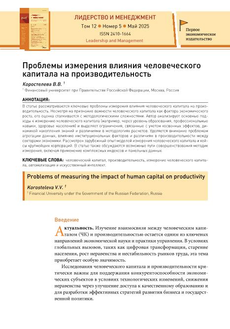 Коростелева, В.В. Проблемы измерения влияния человеческого капитала на производительность // Лидерство и менеджмент. – 2025. – № 5. — С. 1225-1246. — Только в электронном виде. — <URL:http://elib.fa.ru/art2025/bv2553.pdf>.