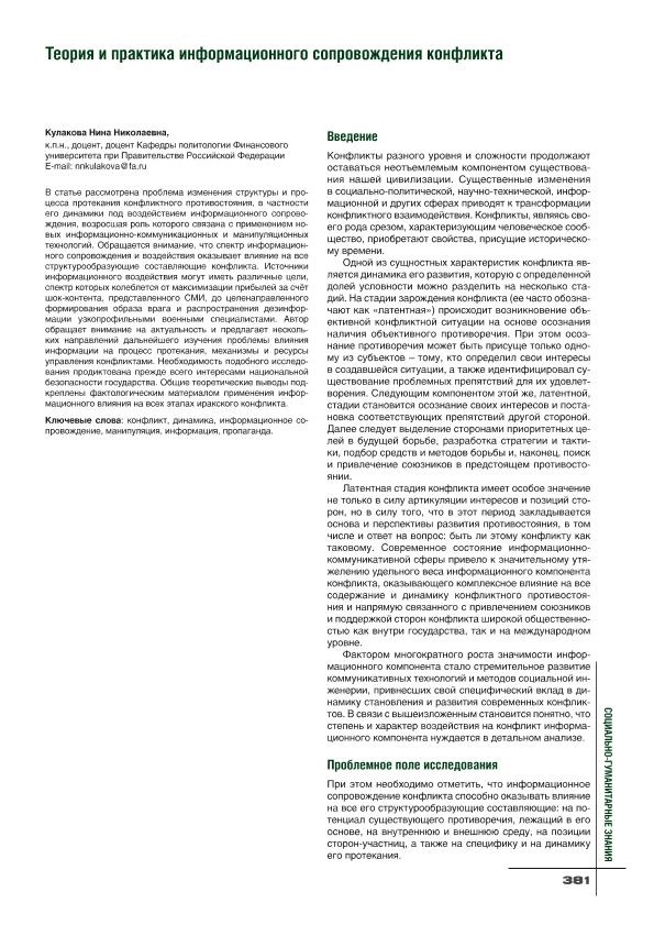 Кулакова, Н.Н. Теория и практика информационного сопровождения конфликта // Социально-гуманитарные знания. – 2025. – № 4. — С. 381-384. — Только в электронном виде. — <URL:http://elib.fa.ru/art2025/bv2557.pdf>.