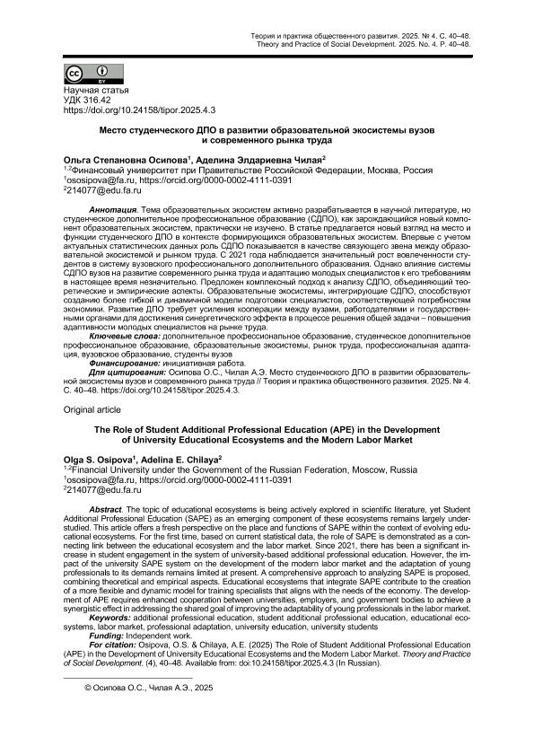 Осипова, О.С. Место студенческого ДПО в развитии образовательной экосистемы вузов и современного рынка труда / О.С. Осипова, А.Э. Чилая // Теория и практика общественного развития. – 2025. – № 4. — С. 40-48. — Только в электронном виде. — <URL:http://elib.fa.ru/art2025/bv697.pdf>.