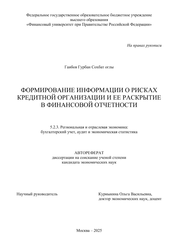 Гаибов, Гурбан Сохбат оглы. Формирование информации о рисках кредитной организации и ее раскрытие в финансовой отчетности: дис. ... кандидата экономических наук ; спец. 5.2.3, защищена 01.12.2025 / Г.С Гаибов; Место защиты: Финуниверситет. — Москва, 2025. — 154 с. — Доступ из локальной сети Финуниверситета (чтение). — <URL:http://elib.fa.ru/avtoreferat/Gaibov25_diss.pdf>.