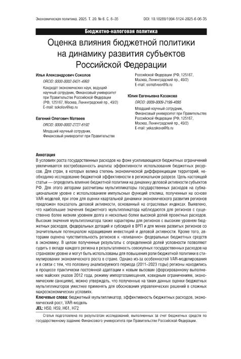 Соколов, И.А. Оценка влияния бюджетной политики на динамику развития субъектов Российской Федерации / И.А. Соколов, Е.О. Матвеев, Ю.Е. Казакова // Экономическая политика. – 2025. – № 6. — С. 6-35 — <URL:http://elib.fa.ru/art2025/bv1809.pdf>.