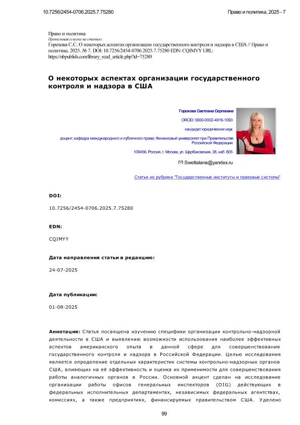 Горохова, С.С. О некоторых аспектах организации государственного контроля и надзора в США. — Текст: электронный // Право и политика. – 2025. – № 7. — С. 99-122. - URL: https://www.nbpublish.com/library_read_article.php?id=75280. - Дата публикации: 01.08.2025 — <URL:http://elib.fa.ru/art2025/bv1810.pdf>.