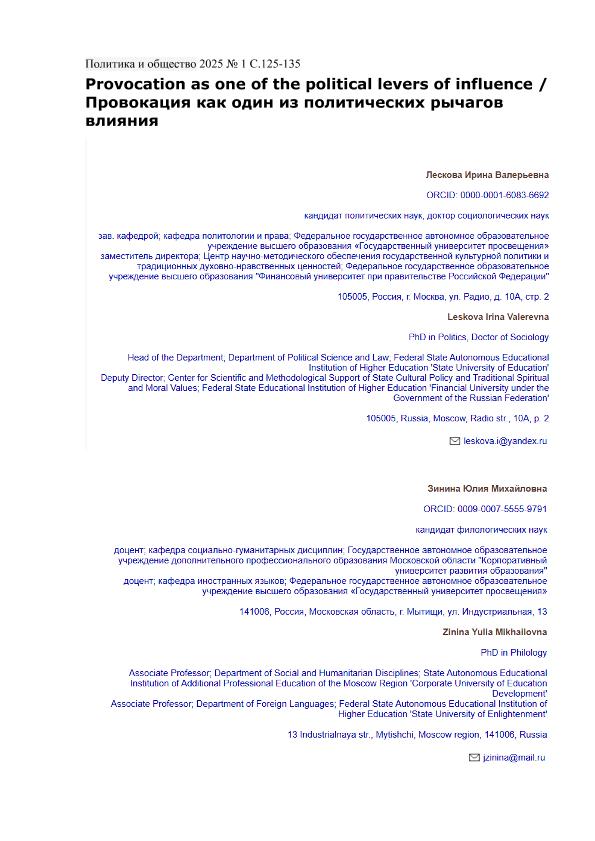 Leskova I.V. (Лескова И.В.). Provocation as one of the political levers of influence = Провокация как один из политических рычагов влияния / Leskova I.V. (Лескова И.В.), Zinina Y.M. (Зинина Ю.М.), Popov A.N. (Попов А.Н.). — Текст: электронный // Политика и общество. – 2025. – № 1. — С. 125-135. - URL: https://nbpublish.com/library_read_article.php?id=72045. - Дата публикации: 03.04.2025 — <URL:http://elib.fa.ru/art2025/bv1812.pdf>.