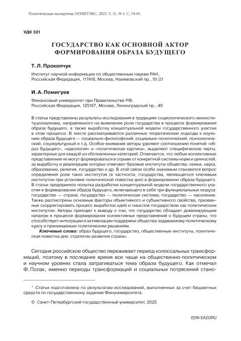 Прокопчук, Т.Л. Государство как основной актор формирования образа будущего / Т.Л. Прокопчук, И.А. Помигуев // Политическая экспертиза: ПОЛИТЭКС. – 2025. – № 1. — С. 74-91. — Только в электронном виде. — <URL:http://elib.fa.ru/art2025/bv1813.pdf>.