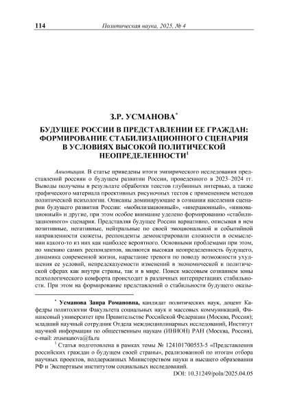Усманова, З.Р. Будущее России в представлении ее граждан: формирование стабилизационного сценария в условиях высокой политической неопределенности // Политическая наука. – 2025. – № 4. — С. 114-139. — Только в электронном виде. — <URL:http://elib.fa.ru/art2025/bv1814.pdf>.