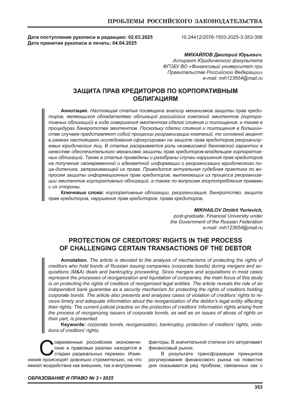 Михайлов, Д.Ю. Защита прав кредиторов по корпоративным облигациям // Образование и право. – 2025. – № 3. — С. 353-356. — Только в электронном виде. — <URL:http://elib.fa.ru/art2025/bv1837.pdf>.
