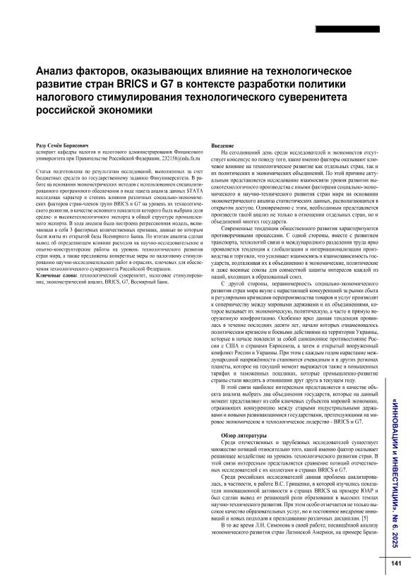 Разу, С.Б. Анализ факторов, оказывающих влияние на технологическое развитие стран BRICS и G7 в контексте разработки политики налогового стимулирования технологического суверенитета