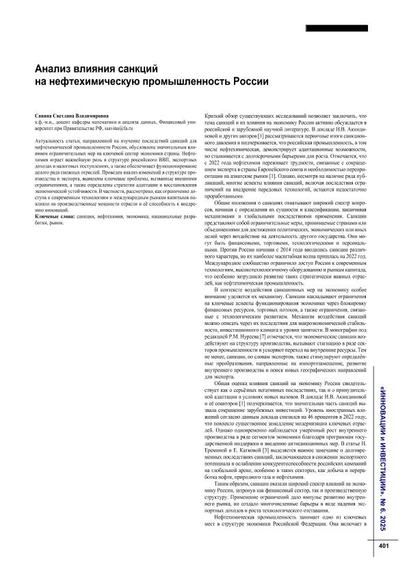 Савина, С.В. Анализ влияния санкций на нефтехимическую промышленность России // Инновации и инвестиции. – 2025. – № 6. — С. 401-404. — Только в электронном виде. — <URL:http://elib.fa.ru/art2025/bv1839.pdf>.