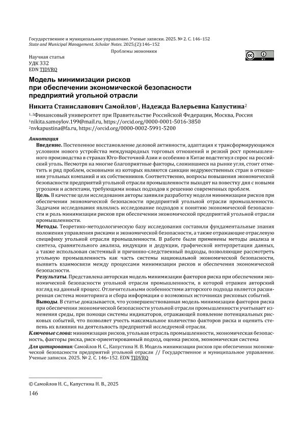 Самойлов, Н.С. Модель минимизации рисков при обеспечении экономической безопасности предприятий угольной отрасли / Н.С. Самойлов, Н.В. Капустина // Государственное и муниципальное управление. Ученые записки. – 2025. – № 2. — С. 146-152. — Только в электронном виде. — <URL:http://elib.fa.ru/art2025/bv1840.pdf>.