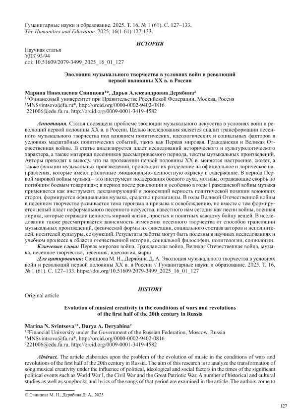 Свинцова, М.Н. Эволюция музыкального творчества в условиях войн и революций первой половины XX в. в России / М.Н. Свинцова, Д.А. Дерябина // Гуманитарные науки и образование. – 2025. – № 1. — С. 127-133. — Только в электронном виде. — <URL:http://elib.fa.ru/art2025/bv1841.pdf>.