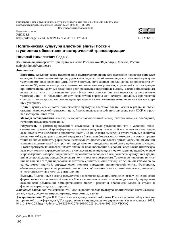 Седых, Н.Н. Политическая культура властной элиты России в условиях общественно-исторической трансформации // Государственное и муниципальное управление. Ученые записки. – 2025. – № 1. — С. 196-203. — Только в электронном виде. — <URL:http://elib.fa.ru/art2025/bv1842.pdf>.