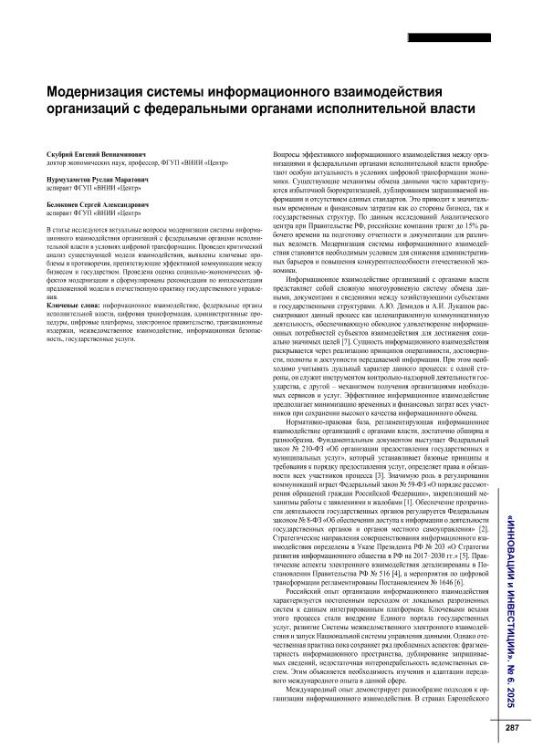 Скубрий, Е.В. Модернизация системы информационного взаимодействия организаций с федеральными органами исполнительной власти / Е.В. Скубрий, Р.М. Нурмухаметов, С.А. Белоконев // Инновации и инвестиции. – 2025. – № 6. — С. 287-291. — Только в электронном виде. — <URL:http://elib.fa.ru/art2025/bv1843.pdf>.