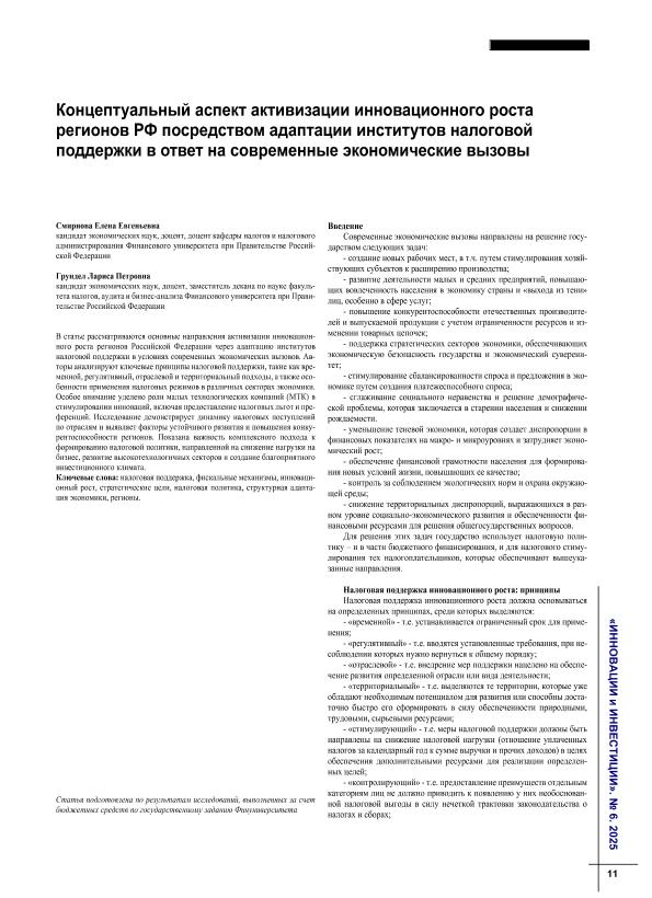 Смирнова, Е.Е. Концептуальный аспект активизации инновационного роста регионов РФ посредством адаптации институтов налоговой поддержки в ответ на современные экономические вызовы / Е.Е. Смирнова, Л.П. Грундел // Инновации и инвестиции. – 2025. – № 6. — С. 11-15. — Только в электронном виде. — <URL:http://elib.fa.ru/art2025/bv1844.pdf>.