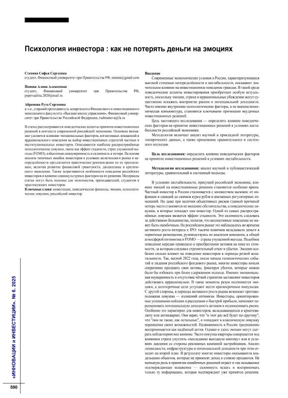 Стенина, С.С. Психология инвестора: как не потерять деньги на эмоциях / С.С. Стенина, А.А. Попова, Р.С. Абрамова // Инновации и инвестиции. – 2025. – № 6. — С. 590-592. — Только в электронном виде. — <URL:http://elib.fa.ru/art2025/bv1845.pdf>.