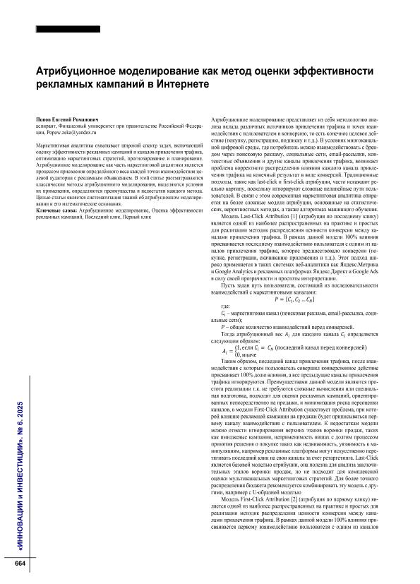 Попов, Е.Р. Атрибуционное моделирование как метод оценки эффективности рекламных кампаний в Интернете // Инновации и инвестиции. – 2025. – № 6. — С. 664-666. — Только в электронном виде. — <URL:http://elib.fa.ru/art2025/bv1832.pdf>.