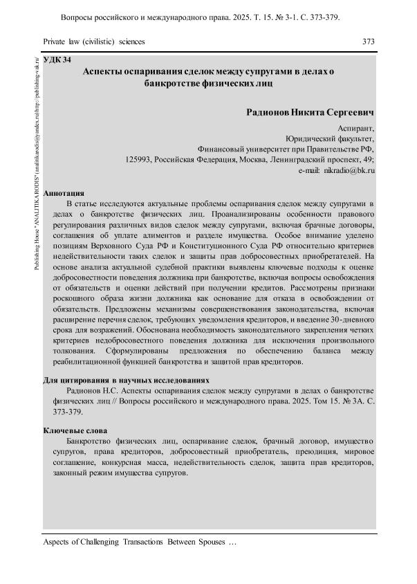 Радионов, Н.С. Аспекты оспаривания сделок между супругами в делах о банкротстве физических лиц // Вопросы российского и международного права. – 2025. – № 3А. — С.373-379. — Только в электронном виде. — <URL:http://elib.fa.ru/art2025/bv1833.pdf>.