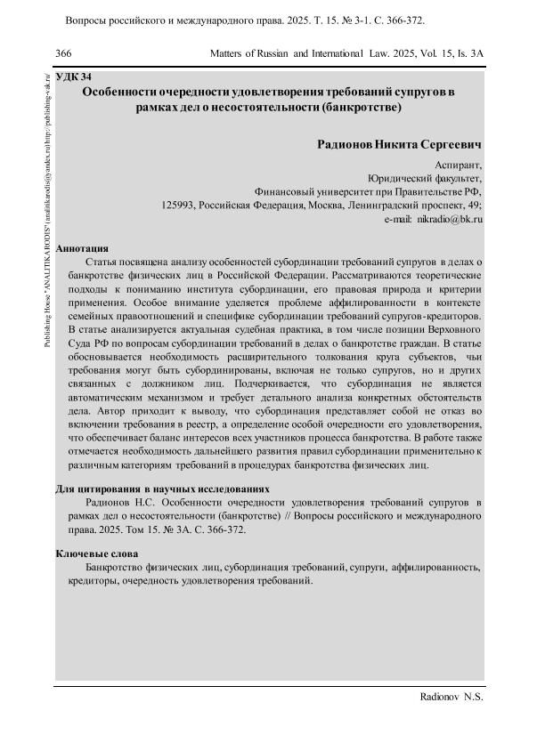 Радионов, Н.С. Особенности очередности удовлетворения требований супругов в рамках дел о несостоятельности (банкротстве) // Вопросы российского и международного права. – 2025. – № 3А. — С.366-372. — Только в электронном виде. — <URL:http://elib.fa.ru/art2025/bv1834.pdf>.