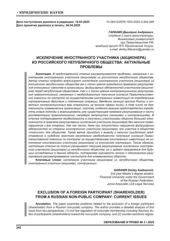 Гаранин, Д.А. Исключение иностранного участника (акционера) из российского непубличного общества: актуальные проблемы // Образование и право. – 2025. – № 3. — С. 342-348. — Только в электронном виде. — <URL:http://elib.fa.ru/art2025/bv1835.pdf>.