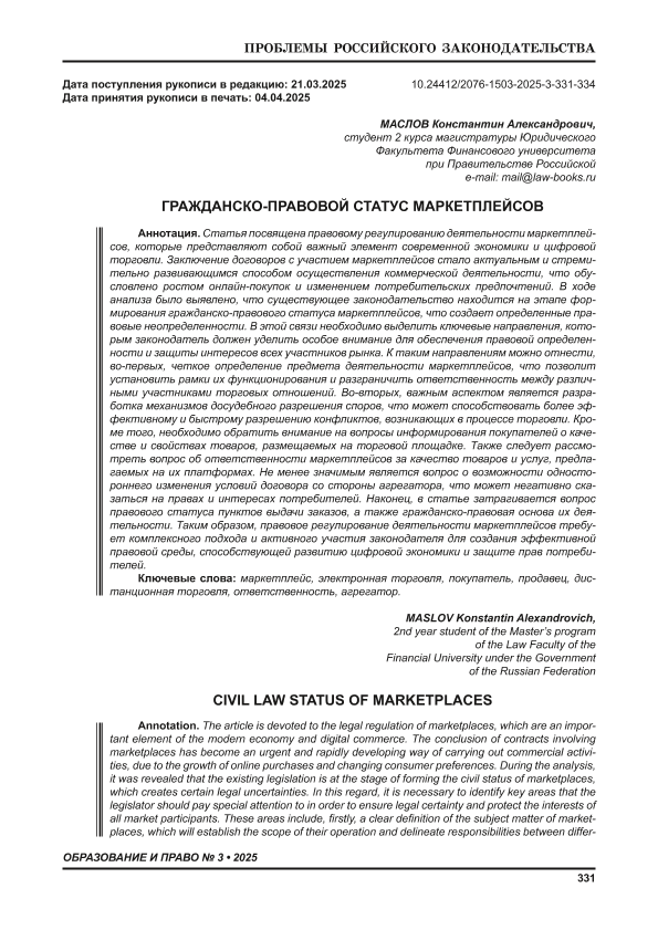 Маслов, К.А. Гражданско-правовой статус маркетплейсов // Образование и право. – 2025. – № 3. — С. 331-334. — Только в электронном виде. — <URL:http://elib.fa.ru/art2025/bv1836.pdf>.