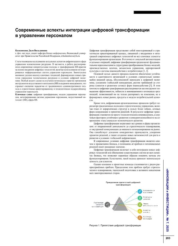 Колесникова, Д.В. Современные аспекты интеграции цифровой трансформации в управлении персоналом // Инновации и инвестиции. – 2025. – № 7. — С. 203-206. — Только в электронном виде. — <URL:http://elib.fa.ru/art2025/bv2013.pdf>.