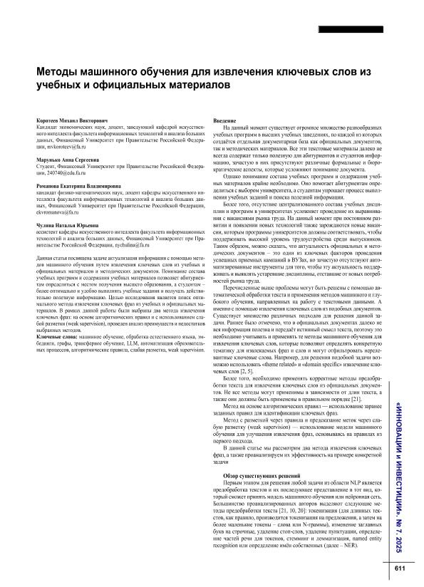 Методы машинного обучения для извлечения ключевых слов из учебных и официальных материалов / М.В. Коротеев, А.С. Марунько, Е.В. Романова, Н.Ю. Чулина // Инновации и инвестиции. – 2025. – № 7. — С. 611-615. — Только в электронном виде. — <URL:http://elib.fa.ru/art2025/bv2015.pdf>.