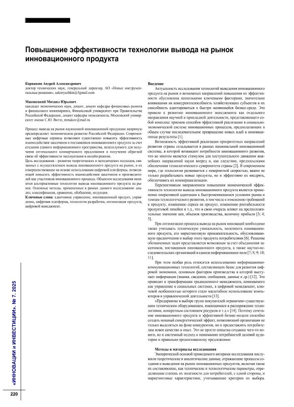 Коряжкин, А.А. Повышение эффективности технологии вывода на рынок инновационного продукта / А.А. Коряжкин, М.Ю. Маковецкий // Инновации и инвестиции. – 2025. – № 7. — С. 220-224. — Только в электронном виде. — <URL:http://elib.fa.ru/art2025/bv2016.pdf>.