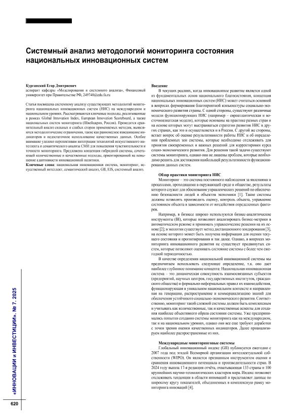 Курганский, Е.Д. Системный анализ методологий мониторинга состояния национальных инновационных систем // Инновации и инвестиции. – 2025. – № 7. — С. 620-623. — Только в электронном виде. — <URL:http://elib.fa.ru/art2025/bv2017.pdf>.