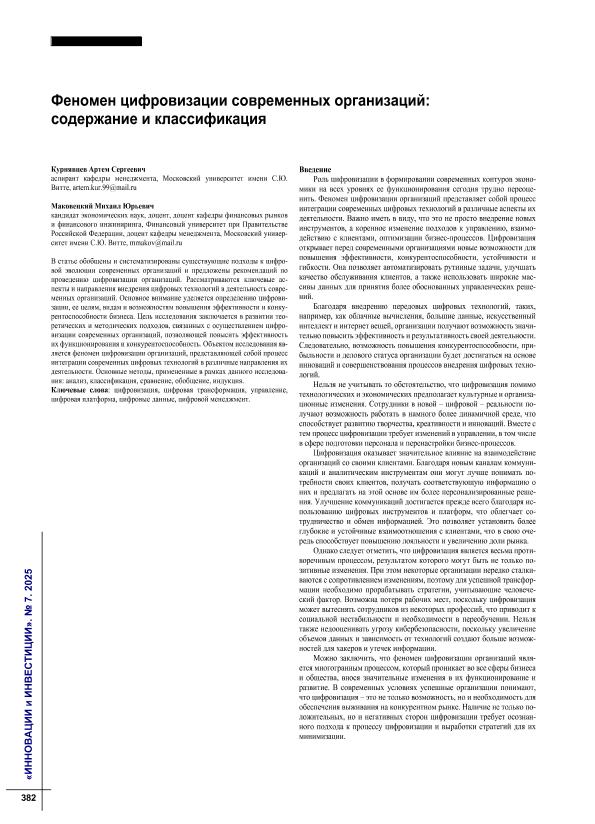 Курнявцев, А.С. Феномен цифровизации современных организаций: содержание и классификация / А.С. Курнявцев, М.Ю. Маковецкий // Инновации и инвестиции. – 2025. – № 7. — С. 382-386. — Только в электронном виде. — <URL:http://elib.fa.ru/art2025/bv2018.pdf>.